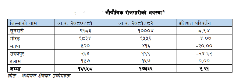 सुनसरी जिल्लामा रहेका उद्योगहरूमा ८ दशमलव ९४ प्रतिशत बढी श्रमिकले रोजगारी पाएका छन् भने मोरङ, झापा र उदयपुर जिल्लामा रहेका उद्योगहरूबाट क्रमशः ४ दशमलव ०७ प्रतिशत, २० प्रतिशत, २४ दशमलव ६२ प्रतिशत श्रमिकले रोजगारी गुमाएका छन् ।
