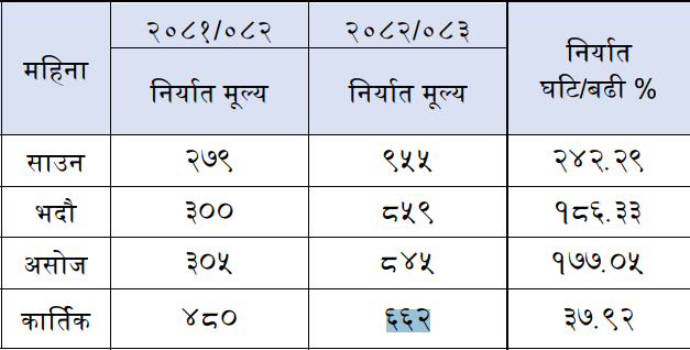 यद्यपि असोजको तुलनामा कात्तिकमा २१ दशमलव ६६ प्रतिशतले निर्यात घटेर ६ अर्ब ६२ करोड रुपैयाँमा खुम्चिएको छ ।