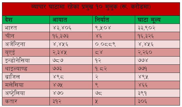 यस्तै अर्जेन्टिनासँग ४४ अर्ब ५६ करोड, युएईसँग २२ अर्ब ६० करोड, इन्डोनेसियासँग ७ अर्ब ७४ करोड मूल्य बराबरको व्यापार घाटा बेहोरेको छ ।