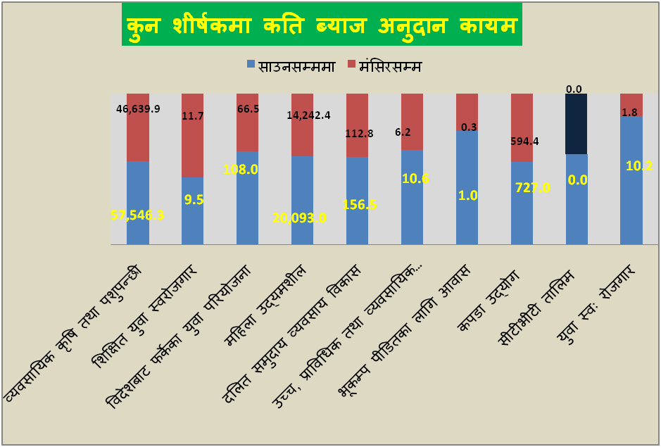 आव २०८२/८३ मा बजारमा कायम ब्याज अनुदान कर्जामध्ये सबैभन्दा बढी व्यवसायिक कृषि तथा पशुपन्छी क्षेत्रमा छ । यो क्षेत्रमा बजारमा कायम कुल अनुदानको ७५ दशमलव ६२ प्रतिशत अर्थात् ४६ अर्ब ६३ करोड रुपैयाँ छ । यसैगरी महिला उद्यमशीलतातर्फ १४ अर्ब २४ करोड, कपडा उद्योगतर्फ ५९ करोड, दलित समुदायतर्फ ११ करोड र विदेशबाट फर्केका युवा परियोजनातर्फ ६ करोड रुपैयाँ ब्याज अनुदान कर्जा बजारमा कायम रहेको तथ्याङ्क छ ।
