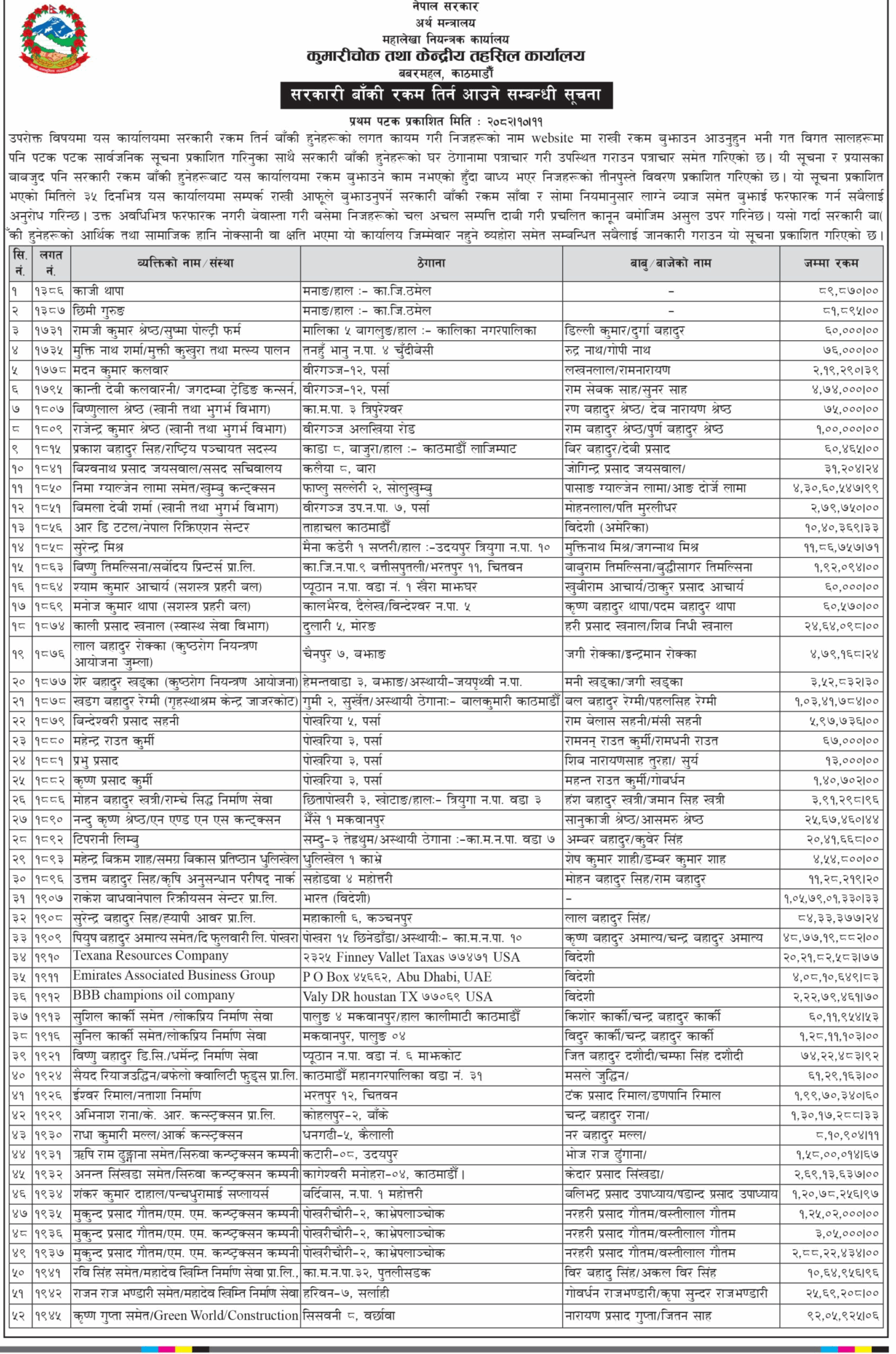 यसअघि पटक–पटक पत्राचार गर्दा र कार्यालयको वेबसाइटमार्फत जानकारी गराउँदा पनि बक्यौता बुझाउन नआएपछि सरकारले अन्तिम पटकका लागि यो सार्वजनिक सूचना जारी गरेको जनाएको छ ।