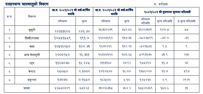 त्यसैगरी, चालु १ अर्ब १४ करोडको चना, १ अर्बको अन्य गेडागुडी, २७ करोडको रहरको दाल, १६ करोडको केराउ र ५ करोड १० लाख रुपैयाँ बराबरको बकुल्लाको आयात भएको तथ्याङ्कमा उल्लेख छ ।