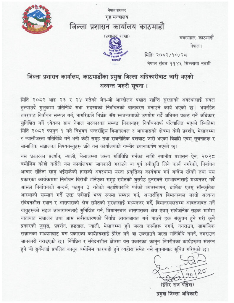साथै सामाजिक सञ्जालमार्फत यस्ता गतिविधि गर्न उक्साउने वा प्रेरित गर्ने कार्य नगर्न पनि चेतावनी दिइएको छ । निषेधित क्षेत्रमा कानुनविपरीतका गतिविधिमा संलग्न जोसुकैलाई प्रचलित कानुनअनुसार कारबाही गरिने सूचनामा उल्लेख छ ।