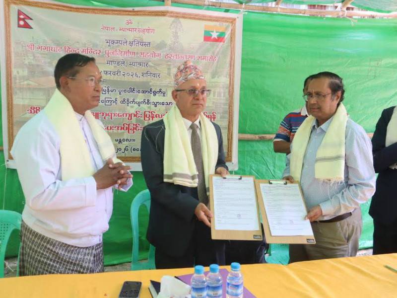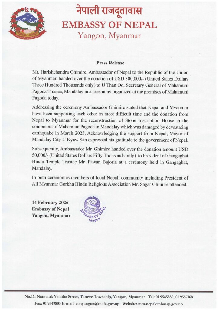 म्यानमारलाई नेपालले दियो साढे ३ लाख डलर, महा मुनी पगोडा र गंगाघाट मन्दिर पुनर्निर्माण गरिने
