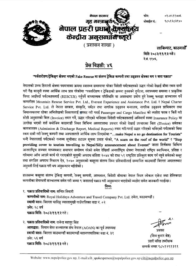 काठमाडौं, १३ फागुन । पर्वतारोहण क्षेत्रमा भएको ‘फेक रेस्क्यू’मा संलग्न थप दुई जना पक्राउ परेका छन् । नेपाल प्रहरीको केन्द्रीय अनुसन्धान ब्युरोले ठमेलस्थित रोयल होलिडेज एडभेञ्चर एण्ड ट्राभल कम्पनीका प्रतिनिधि २८ वर्षीय सन्दीप तिवारी र विमान सेवा सञ्चालक सङ्घका पूर्वउपाध्यक्ष ५६ वर्षीय राजेन्द्रबहादुर सिंहलाई पक्राउ गरेको हो ।
