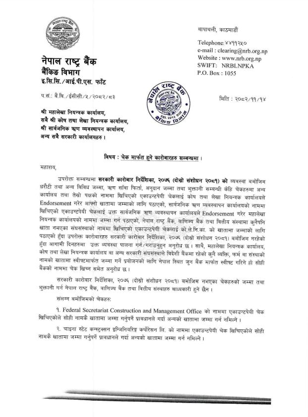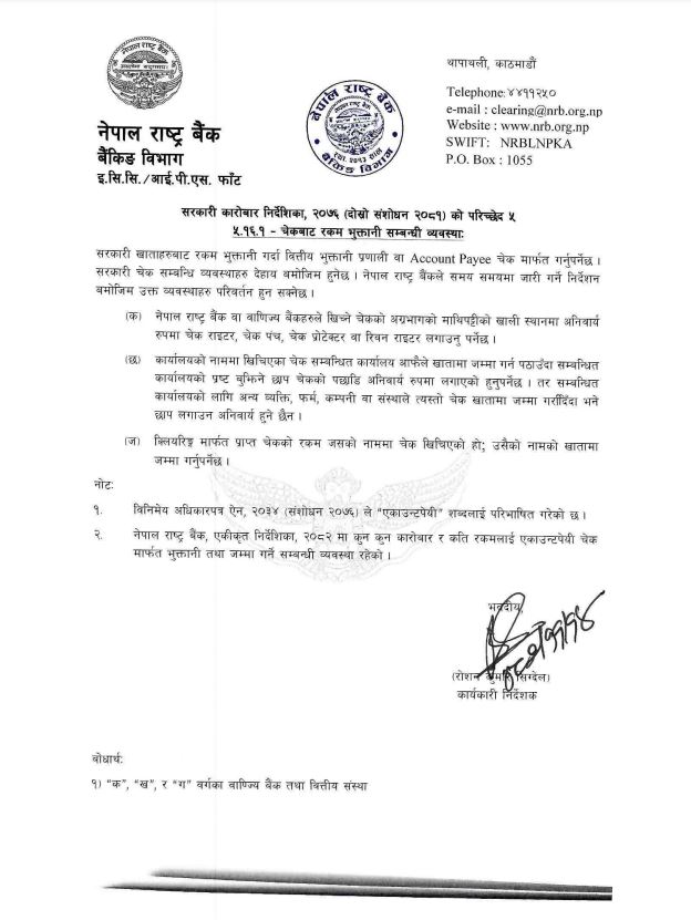 राष्ट्र बैंकले सरकारी कारोबार निर्देशिका, २०७६ (दोस्रो संशोधन २०८१) को परिच्छेद ५ को ५.१६.१ मा रहेको चेकबाट रकम भुक्तानीसम्बन्धी व्यवस्थालाई प्रभावकारी बनाउन थप प्रावधान लागू गरेको हो ।