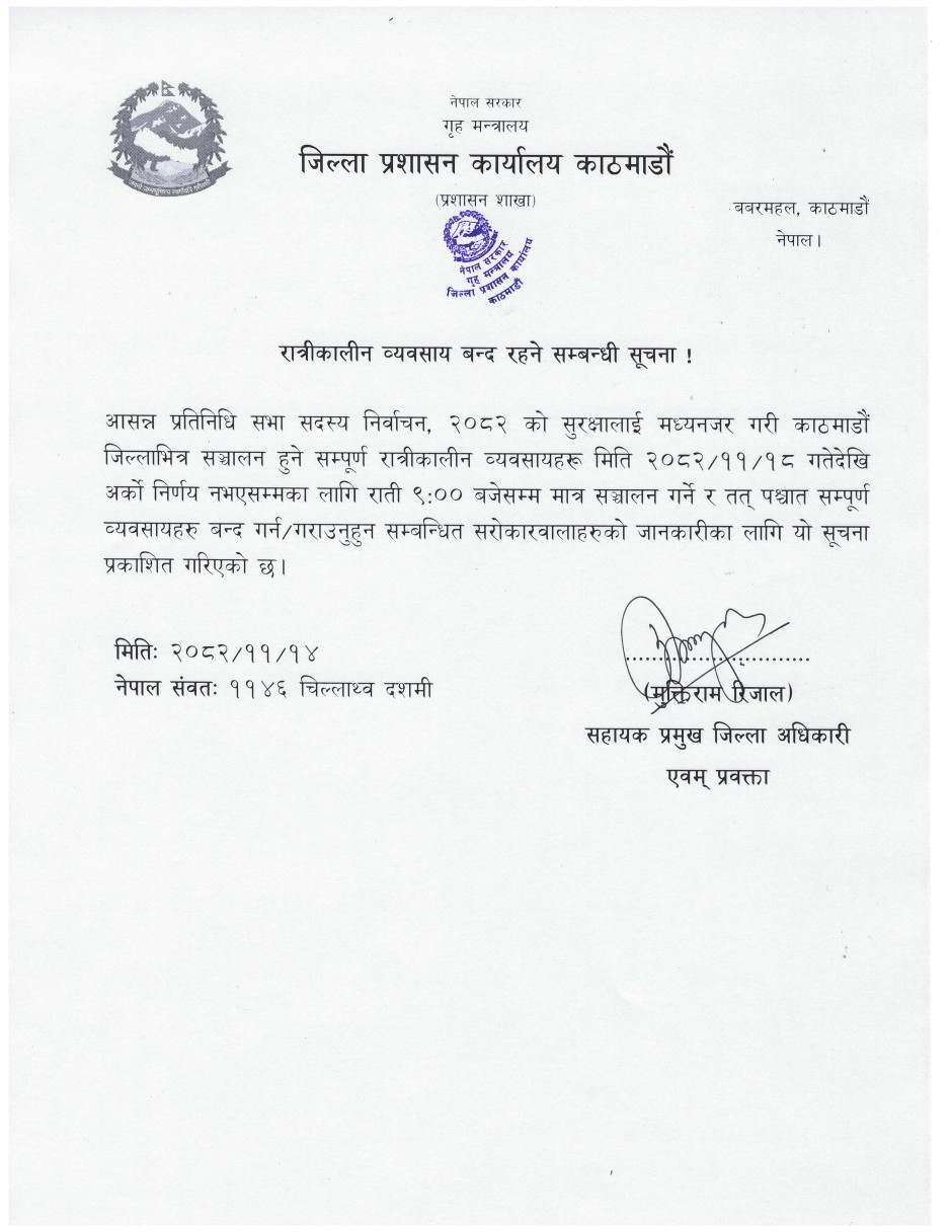 काठमाडौं, १५ फागुन । जिल्ला प्रशासन कार्यालय काठमाडौंले आसन्न प्रतिनिधि सभा सदस्य निर्वाचनको सुरक्षालाई मध्यनजर गर्दै काठमाडौ जिल्लाभित्र सञ्चालन हुने सम्पूर्ण रात्रीकालीन व्यवसायहरूमा समय निर्धारण गरेको छ ।