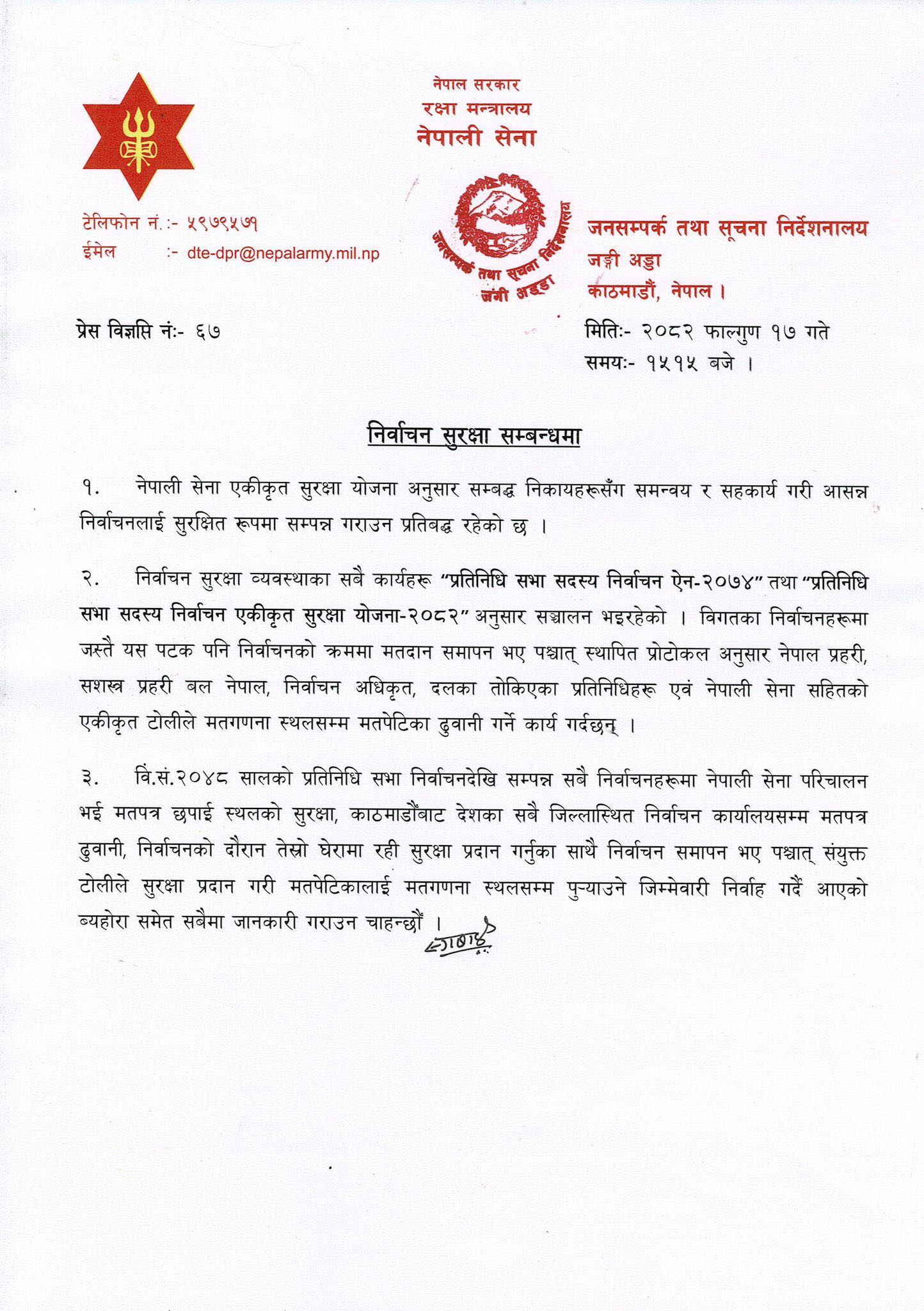 निर्वाचन सुरक्षा व्यवस्थाका सबै कार्यहरू ’प्रतिनिधि सभा सदस्य निर्वाचन ऐन–२०७४’ तथा ’प्रतिनिधि सभा सदस्य निर्वाचन एकीकृत सुरक्षा योजना–२०८२’ अनुसार सञ्चालन भइरहेको उल्लेख गर्दै विगतका निर्वाचनहरूमा जस्तै यस पटक पनि निर्वाचनको क्रममा मतदान समापन भए पश्चात् स्थापित प्रोटोकल अनुसार नेपाल प्रहरी, सशस्त्र प्रहरी बल नेपाल, निर्वाचन अधिकृत, दलका तोकिएका प्रतिनिधिहरू एवं नेपाली सेना सहितको एकीकृत टोलीले मतगणना स्थलसम्म मतपेटिका ढुवानी गर्ने कार्य गर्ने नेपाली सेनाले जनाएको छ ।