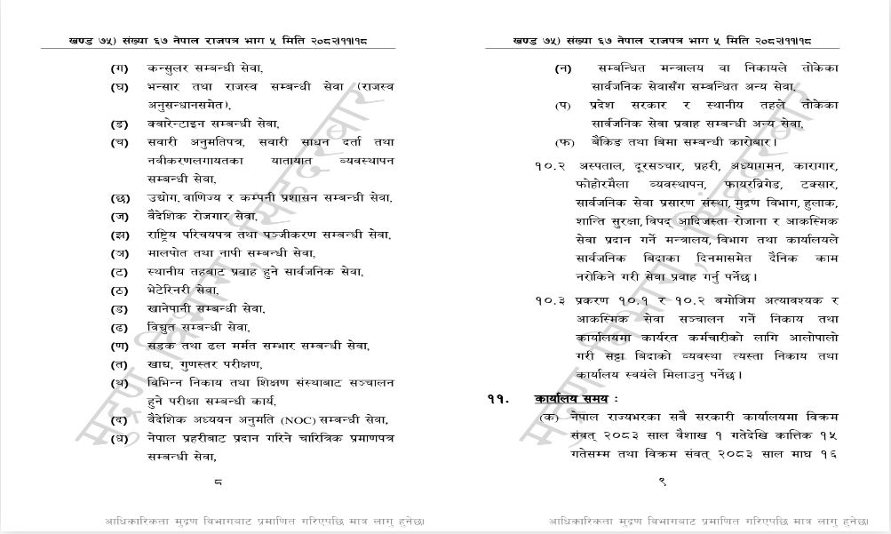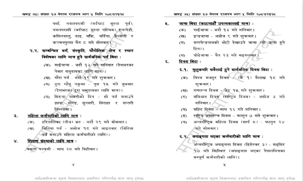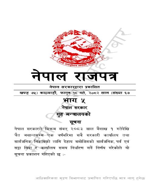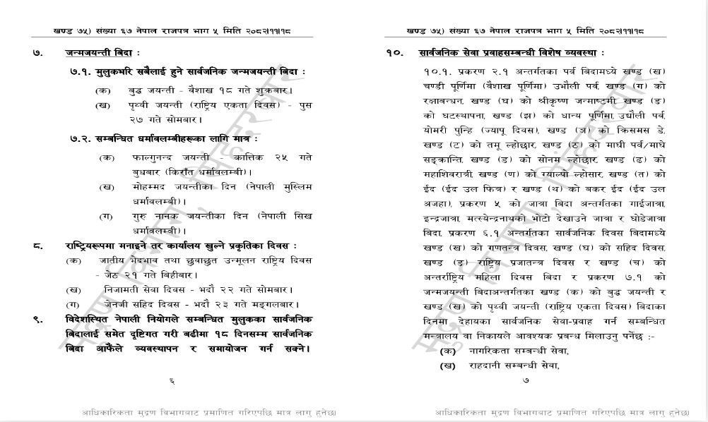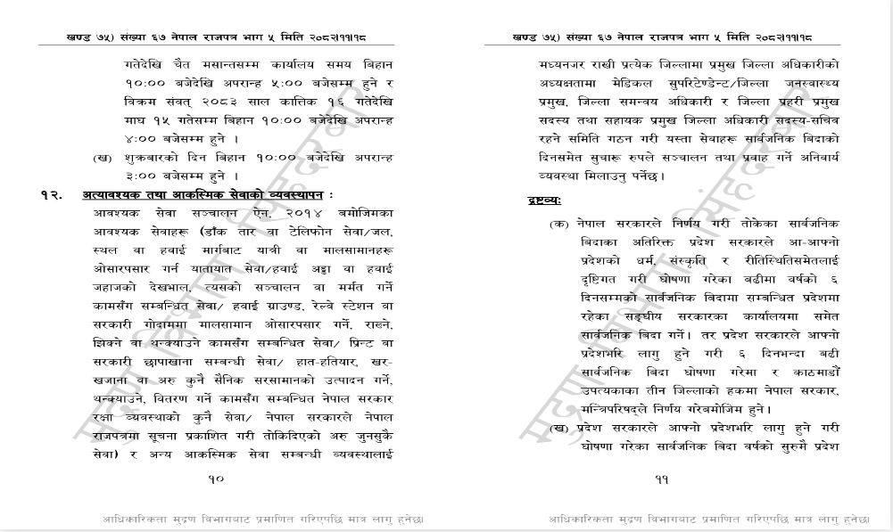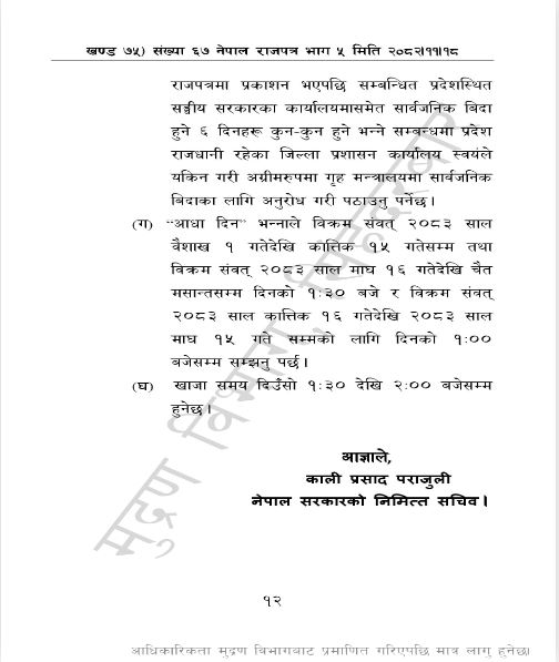 ‘नेपाल सरकारले विक्रम संवत् २०८३ साल वैशाख १ गतेदेखि चैत मसान्तसम्म एक वर्षभरिमा सबै सरकारी कार्यालय तथा सार्वजनिक निकायको लागि देहाय बमोजिमको सार्वजनिक, पर्व एवं सट्टा बिदा र कार्यालय समय निर्धारण गर्ने निर्णय गरेकोले यो सूचना प्रकाशन गरिएको छ,’ राजपत्रमा भनिएको छ ।
