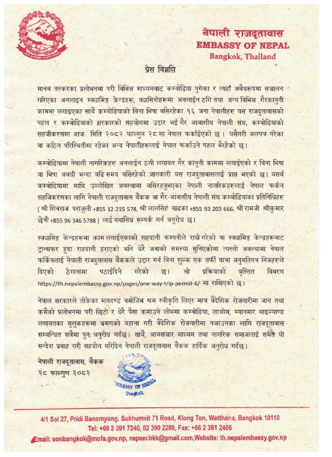 कम्बोडियामा केही नेपालीहरूलाई अनलाइन ठगी लगायतका गैरकानुनी गतिविधिमा लगाइएको तथा बिना भिसा वा भिसा अवधि सकिएपछि पनि बसिरहेको जानकारी प्राप्त भएको दूतावासले जनाएको छ । यस्तो अवस्थामा रहेका नेपाली नागरिकलाई नेपाल फर्किन सहजीकरणका लागि नेपाली राजदूतावास बैंकक वा गैरआवासीय नेपाली संघ कम्बोडियाका प्रतिनिधिसँग सम्पर्क गर्न आग्रह गरिएको छ ।