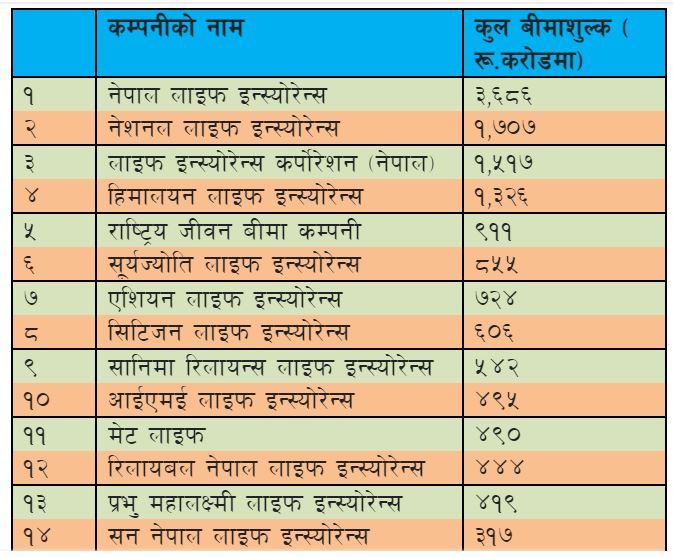 जीवन बीमा व्यवसाय गर्ने १४ बीमकहरु रहेका छन् । यी बीमकमध्ये सबैभन्दा धेरै व्यवसाय गर्नेमा नेपाल लाइफ इन्स्योरेन्स कम्पनी लिमिटड रहेको छ । कम्पनीले ३६ अर्ब ८६ करोड १९ लाख रुपैयाँ कुल बीमाशुल्क संकलन गरेको छ । दोस्रो धेरै बीमा शुल्क आर्जन गर्नेमा नेसनल लाइफ रहेको छ । कम्पनीले चैत मसान्तसम्ममा १७ अर्ब ७ करोड ९४ लाख रुपैयाँ कुल बीमाशुल्क संकलन गरेको छ । तेस्रोमा लाइफ इन्स्योरेन्स कर्पोरेसन (एलआईसी नेपाल) ले १५ अर्ब १७ करोड ८ लाख रुपैयाँ बीमाशुल्क संकलन गरेको छ ।