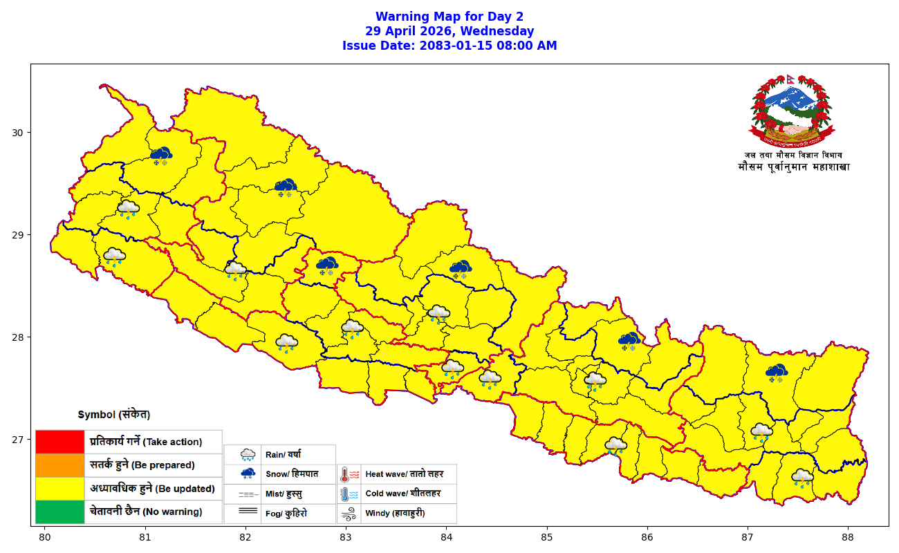यसैगरी १६ गते बुधबार पनि कोशी प्रदेशको हिमाली र पहाडी भू–भाग तथा गण्डकी प्रदेशको पहाडी भू–भागको एक–दुई स्थानमा मेघगर्जन र चट्याङ्ग सहित भारी वर्षा तथा हिमपातको पनी सम्भावना रहेको छ । तराई भू–भागका केही स्थानहरुमा हावाहुरीको पनि सम्भावना रहेको विभागले जनाएको छ ।