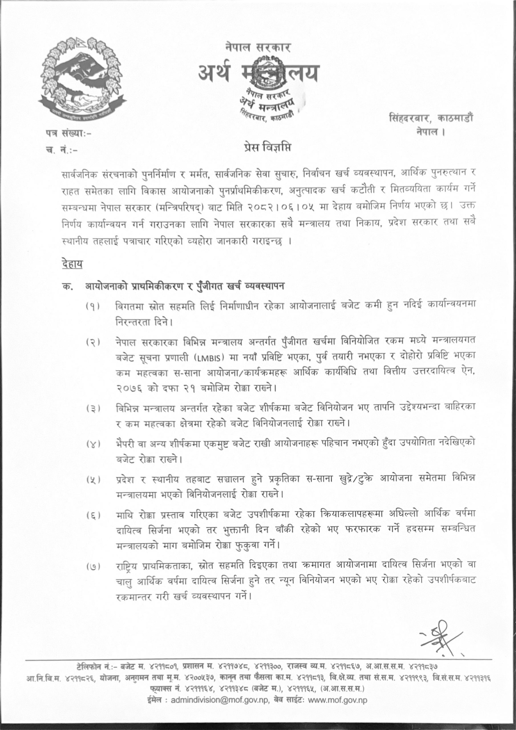 काठमाडौं, ८ असोज । असोज ५ गते बसेको मन्त्रिपरिषद् बैठकले खर्च कटौती र मितव्ययितालाई प्राथमिकतामा राख्दै विभिन्न कडाइका निर्णय गरेको छ । बैठकले सार्वजनिक संरचना पुनर्निर्माण, सेवा प्रवाह, निर्वाचन खर्च र आर्थिक पुनरुत्थानका लागि अनावश्यक खर्च रोक्ने नीति अघि सारेको हो ।