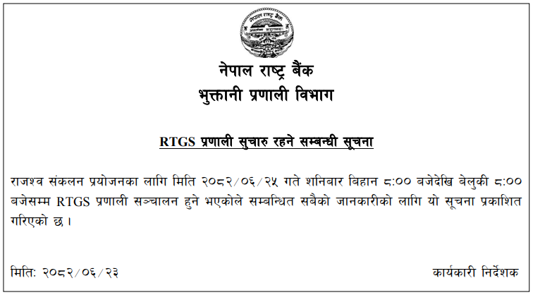 शनिबार पनि राजस्व संकलनका लागि आरटीजीएस प्रणाली सञ्चालन हुने