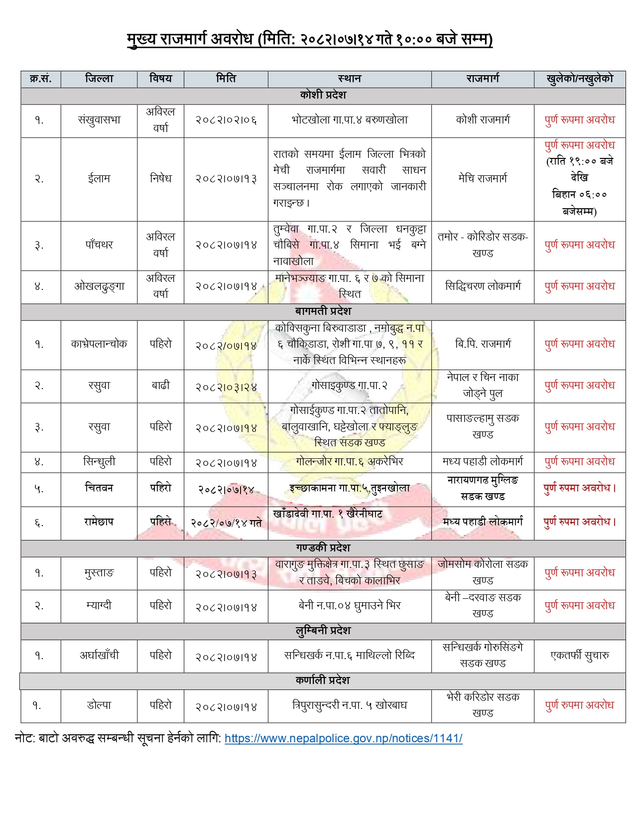 त्यस्तै, रसुवाको नेपाल– चीन जोड्ने पुल र पासाङल्हामु सडक बन्द छ भने सिन्धुलीको गोलन्जोरस्थित अकरेभिर र रामेछापको खाँडादेवीस्थित खैरेनीघाट मध्य पहाडी लोकमार्ग, चीतवनस्थित नारायण्गढ मुग्लिङ सडक पूर्ण रुपमा अवरुद्ध छ । मुस्ताङको जोमसोम कोरोला सडक, म्याग्दीको बेनी– दरवाङ सडक र डोल्पाको भेरी करिडोर सडक पनि बन्द रहेको प्रहरीले जनाएको छ ।