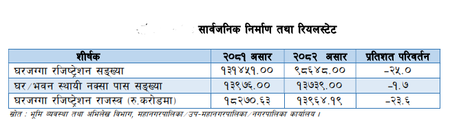समीक्षा वर्षमा घरजग्गा रजिष्ट्रेशनबापतको राजस्व २३ दशमलव ६ प्रतिशतले घटेर १ खर्ब ३९ अर्ब रुपैयाँ कायम भएको छ । गत वर्षको सोही अवधिमा पनि यस्तो राजस्व २६ दशमलव २३ प्रतिशतले घटेको थियो । समीक्षा वर्षमा घर/भवन नक्सापास सङ्ख्या १ दशमल ७ प्रतिशतले घटेको छ ।