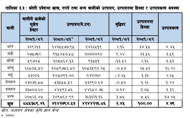 गत आवमा कोशीमा खाद्य, नगदे तथा अन्य बालीको उत्पादन ४२ लाख ४४ हजार २ सय २७ मेट्रिक टन पुगेको छ, जुन अघिल्लो आवको तुलनामा २.४५ प्रतिशतले बढी हो । आ.व. २०८१/८२ मा धान २.१६, मकै ९.२४, भटमास १.०९ र उखुको उत्पादन ४.२४ प्रतिशतले बढेको छ भने गहुँ ४.६५, कोदो १३.५२, जौ २४.५६, फापर ३.८६, सुर्ती १४.२९ र आलुको उत्पादन ०.५७ प्रतिशतले घटेको छ ।