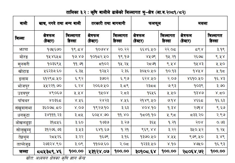 कोशीका जिल्लामा कृषि उपजले ढाकेको क्षेत्रफल :
