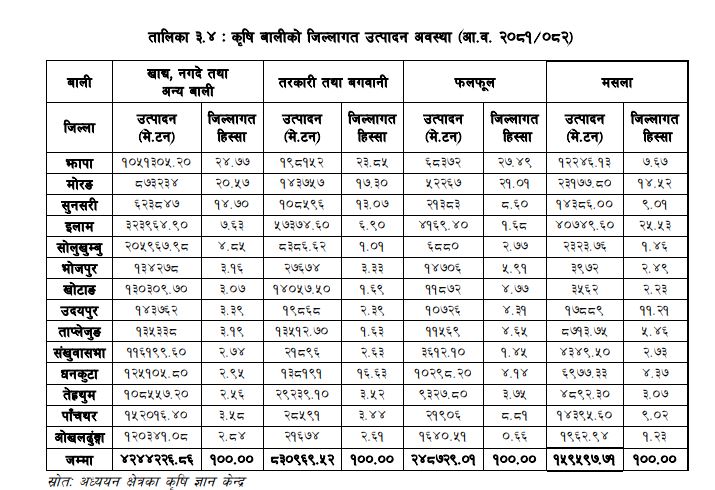 कोशीका कुन जिल्लामा कति भयो उत्पादन ?