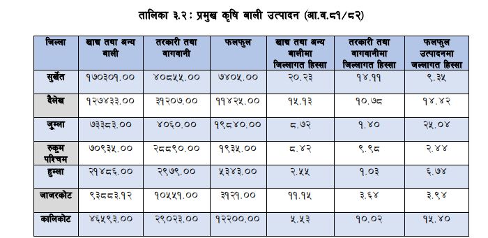 आव २०८१/८२ मा कर्णाली प्रदेशमा खाद्य तथा अन्य बालीको उत्पादन ३ दशमलव ९५ प्रतिशतले घटेको छ । प्रमुख कृषि बालीमध्ये मकै बालीको उत्पादन ४.२४ प्रतिशतले वृद्धि भएको छ । त्यस्तै, आव २०८०÷८१ मा १२.०४ प्रतिशतले वृद्धि भएको धान उत्पादन आव २०८१/८२ मा १०.२५ प्रतिशतले घटेको छ । सो वर्ष गहुँ १७.३१ प्रतिशत, कोदो १६.७३ प्रतिशत,, जौ ,१८.९८ प्रतिशत र फापरको उत्पादनमा २५.६९ प्रतिशतले कमी आएको छ ।