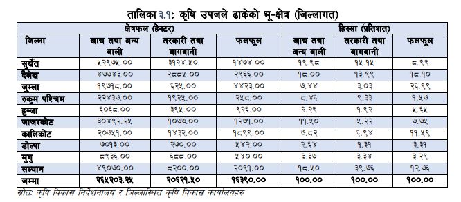 कर्णाली प्रदेशमा रहेका १० जिल्लाहरुमध्ये खाद्य तथा अन्य बालीले ढाकेको कुल क्षेत्रफलमा सुर्खेतले सबैभन्दा धेरै १९.९८ प्रतिशत र हुम्ला जिल्लालेसबैभन्दा कम २.२९ प्रतिशत हिस्सा ओगटेको छ ।