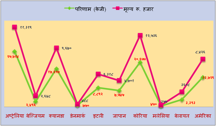 विशेषगरी नेपालबाट अष्ट्रेलिया, अमेरिका, बेलायत, कोरिया, जापान लगायत मुलुकमा अचार निर्यात गरिँदै आएको छ । गत कात्तिकसम्ममा सबैभन्दा धेरै कोरियामा १ करोड २५ लाख रुपैयाँ बराबरको निर्यात भएको छ । यस्तै अष्ट्रेलियामा १ करोड १३ लाख, क्यान्डामा ९६ लाख, अमेरिकामा ८४ लाख र इटलीमा ६३ लाख रुपैयाँ बराबरको अचार बाहिरिएको तथ्यांक छ ।
