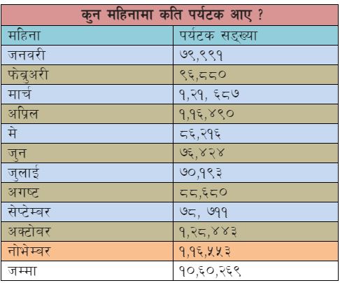 सन् २०१९ को नोभेम्बरमा १९ हजार ६७९ भारतीय पर्यटक नेपाल आएका थिए । पछिल्लो वर्ष कोभिड १९ ले भारतबाट आउने पर्यटक ठप्प थियो । २०२१ को नोभेम्बरमा केही सुधार देखिएको भारतीय पर्यटक आगमन २३ सम्म बढ्दो क्रममा थियो । तर, तीन वर्ष यता भारतीय पर्यटक निरन्तर घटिरहेको तथ्याङ्कले देखाउँछ ।