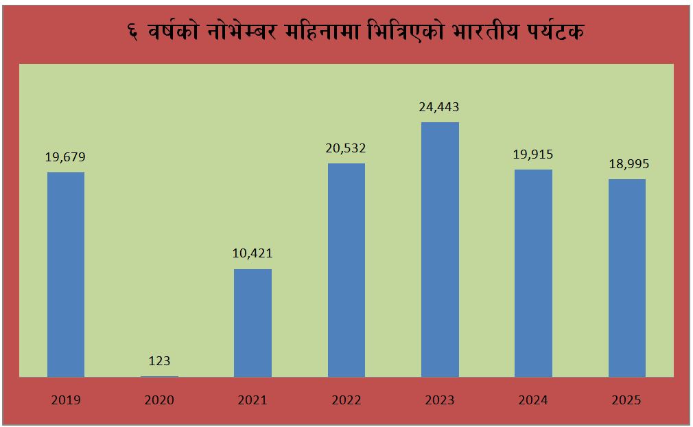 नेपाल पर्यटन बोर्डका अनुसार सन् २०२५ को नोभेम्बरमा १८ हजार ९९५ भारतीय पर्यटक नेपाल घुम्न आएका छन् । गत वर्षको सोही महिनामा भारतबाट १९ हजार ९१५ पर्यटकको आगमन भएको थियो ।