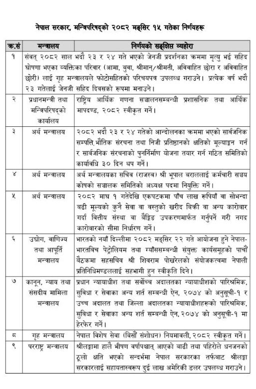 सरकारले ‘जेनजी’ प्रदर्शनका क्रममा मृत्यु भई सहिद घोषणा गरिएका व्यक्तिका परिवारलाई तस्बिरसहितको परिचयपत्र उपलब्ध गराउने निर्णय गरेको छ । त्यस्तो परिचय पत्र आमा, बुवा, श्रीमान्, श्रीमती र अविवाहित छोरा, छोरीलाई दिइने छ । त्यस्तै बैठकले प्रत्येक वर्ष भदौ २३ गतेलाई ‘जेनजी सहिद दिवस’का रूपमा मनाउने निर्णय गरेको मन्त्री खरेलले बताए ।